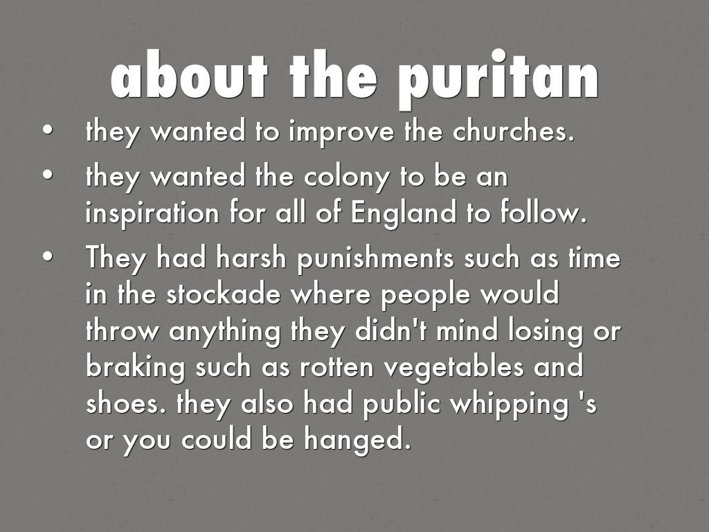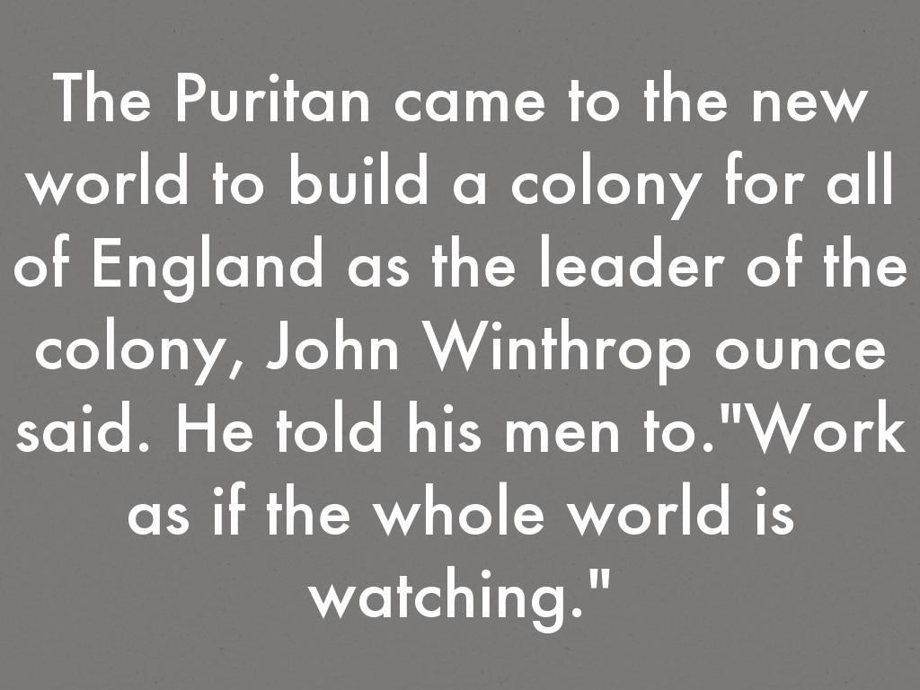 The Puritan came to the new world to build a colony for all of England as the leader of the colony, John Winthrop ounce said. He told his men to."Work as if the whole world is watching."