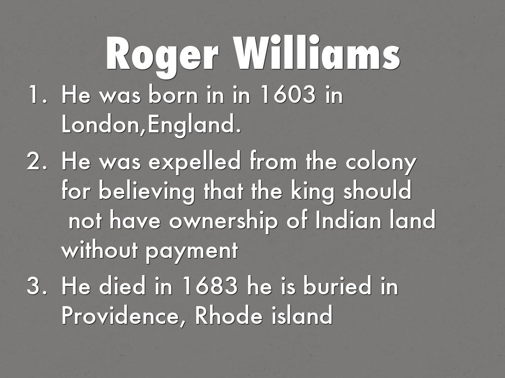 - He was expelled from the colony for believing that the king should not have ownership of Indian land without payment