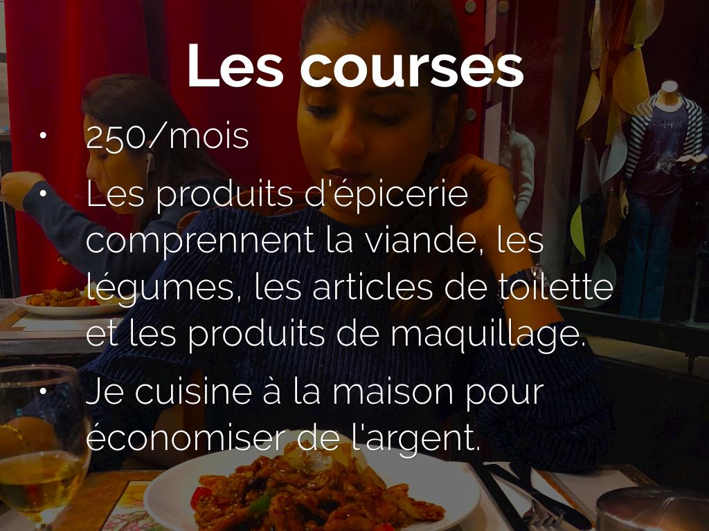 Les produits d'épicerie comprennent la viande, les légumes, les articles de toilette et les produits de maquillage.