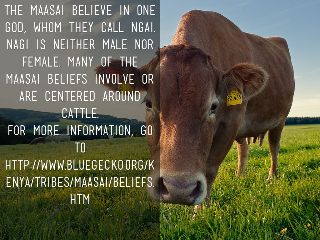 The Maasai believe in one God, whom they call Ngai. Nagi is neither male nor female. Many of the Maasai beliefs involve or are centered around cattle. For more information, go to http://www.bluegecko.org/kenya/tribes/maasai/beliefs.htm