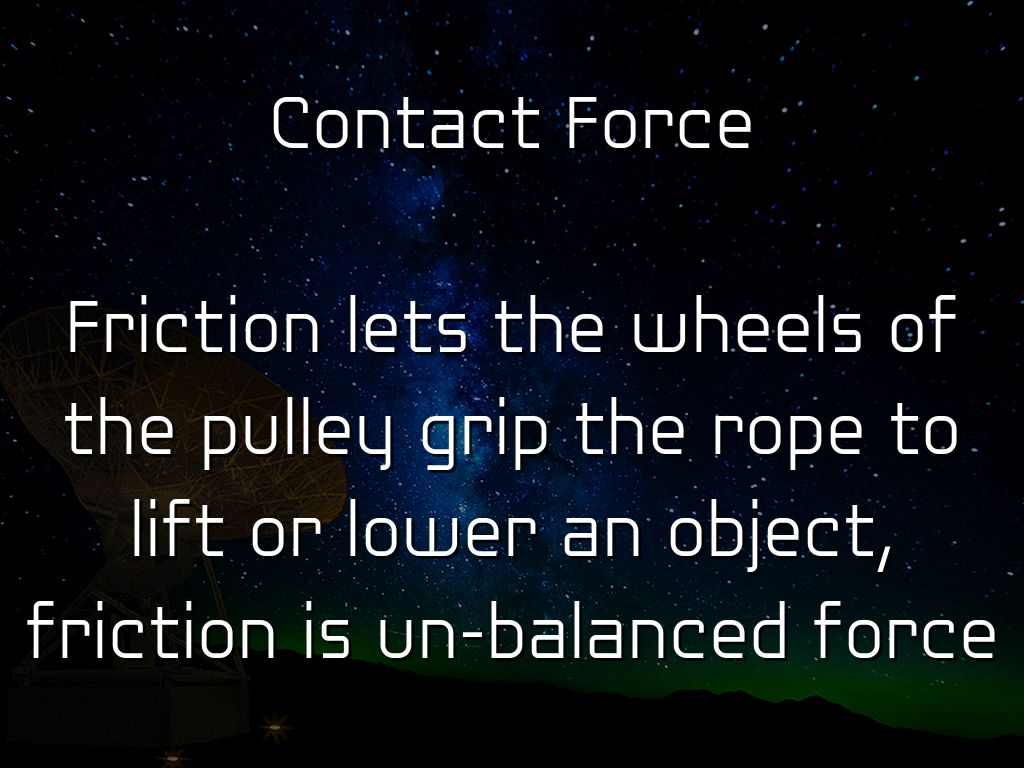 Friction lets the wheels of the pulley grip the rope to lift or lower an object, friction is un-balanced force