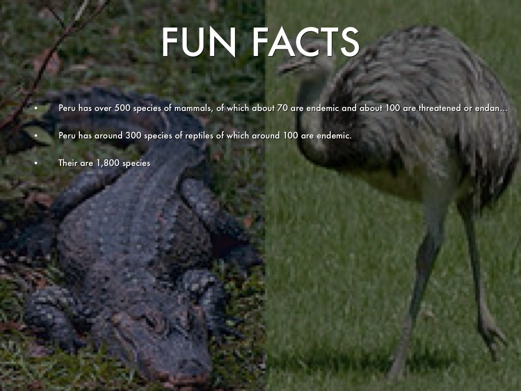 • Peru has over 500 species of mammals, of which about 70 are endemic and about 100 are threatened or endangered.