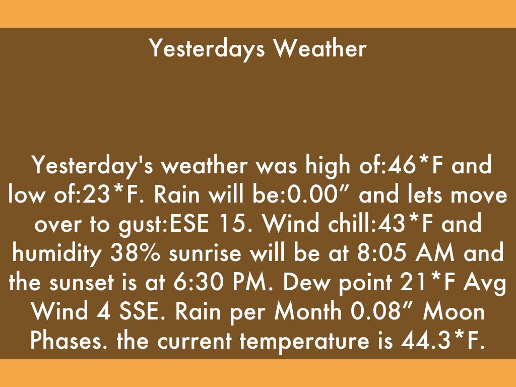 Yesterday's weather was high of:46*F and low of:23*F. Rain will be:0.00” and lets move over to gust:ESE 15. Wind chill:43*F and humidity 38% sunrise will be at 8:05 AM and the sunset is at 6:30 PM. Dew point 21*F Avg Wind 4 SSE. Rain per Month 0.08” Moon Phases. the current temperature is 44.3*F.