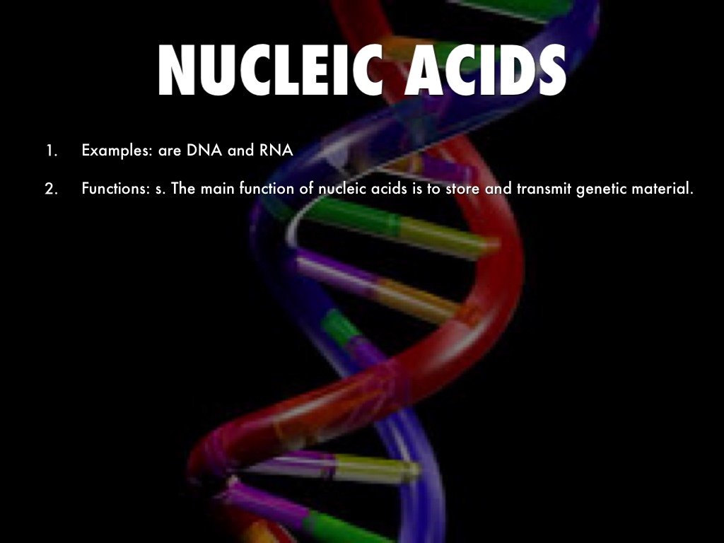 Functions: s. The main function of nucleic acids is to store and transmit genetic material.