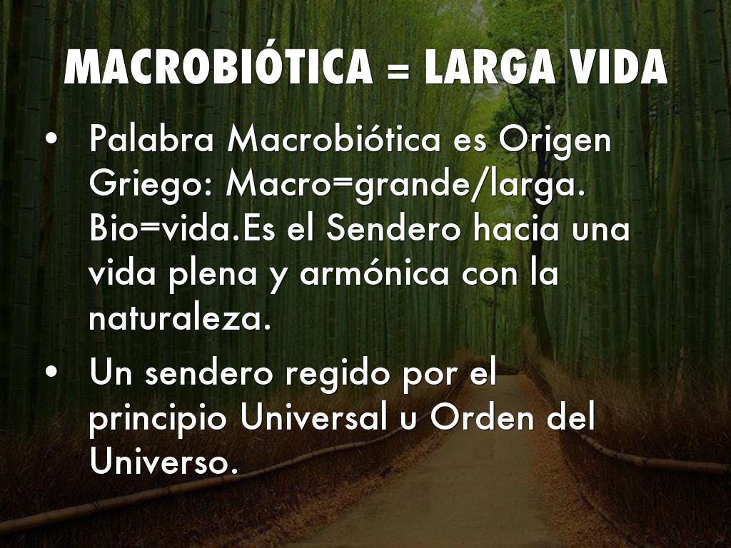- Palabra Macrobiótica es Origen Griego: Macro=grande/larga. Bio=vida.Es el Sendero hacia una vida plena y armónica con la naturaleza.