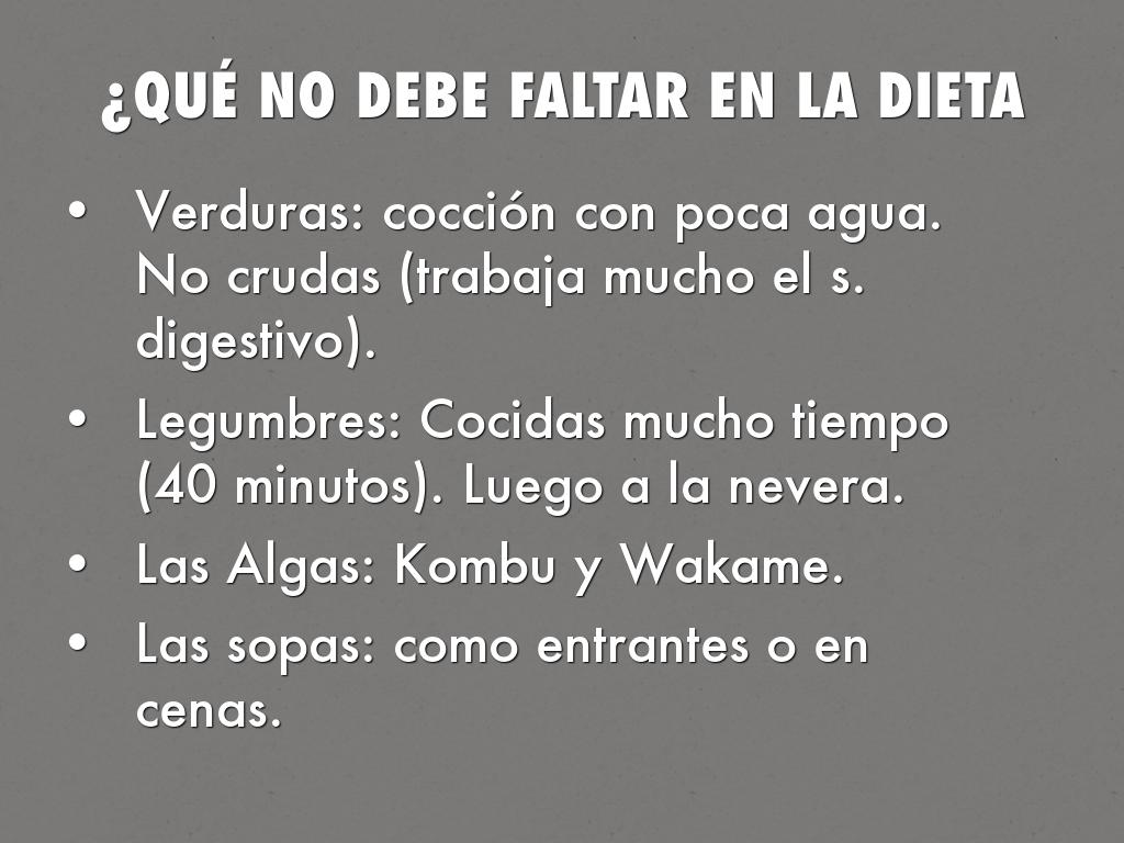 - Verduras: cocción con poca agua. No crudas (trabaja mucho el s. digestivo).