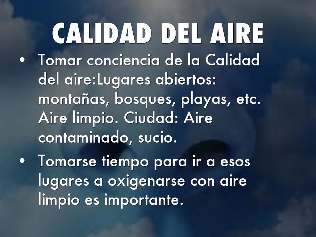 - Tomar conciencia de la Calidad del aire:Lugares abiertos: montañas, bosques, playas, etc. Aire limpio. Ciudad: Aire contaminado, sucio.