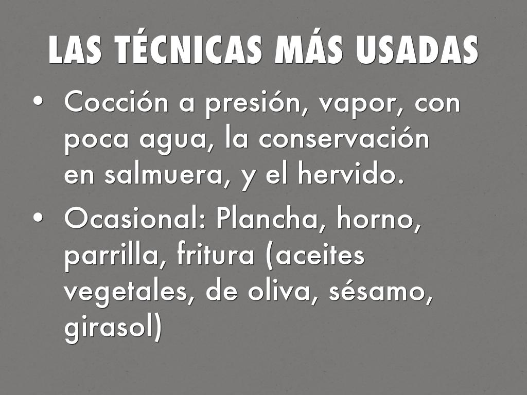 - Cocción a presión, vapor, con poca agua, la conservación en salmuera, y el hervido.
