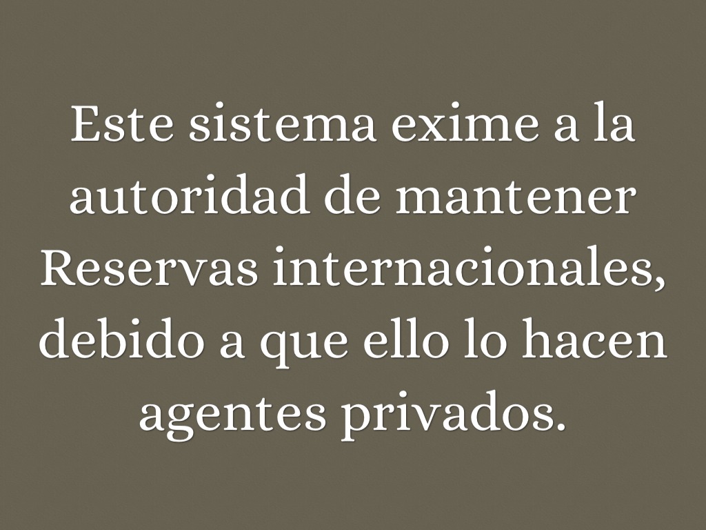Este sistema exime a la autoridad de mantener Reservas internacionales, debido a que ello lo hacen agentes privados.