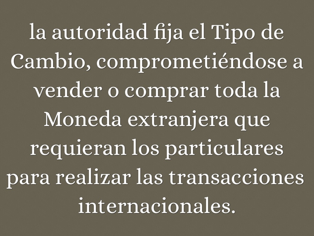 la autoridad fija el Tipo de Cambio, comprometiéndose a vender o comprar toda la Moneda extranjera que requieran los particulares para realizar las transacciones internacionales.
