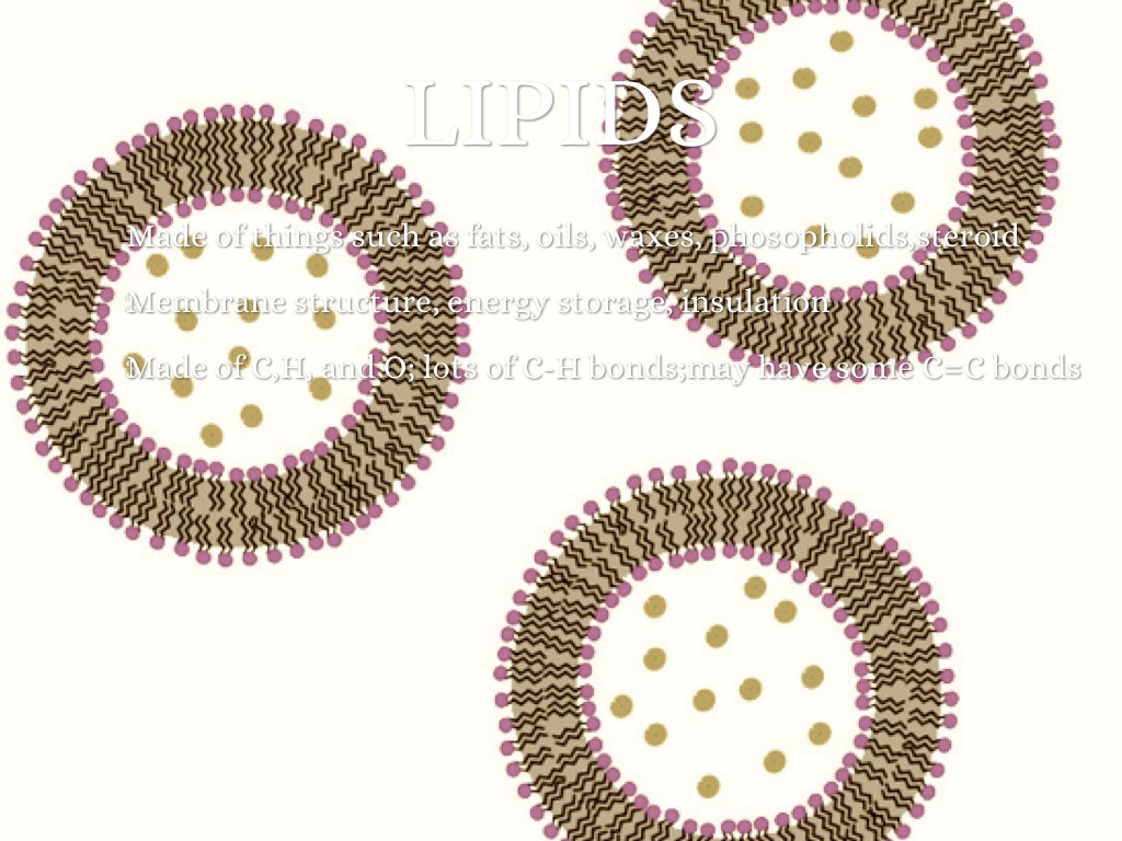 Made of things such as fats, oils, waxes, phosopholids,steroid