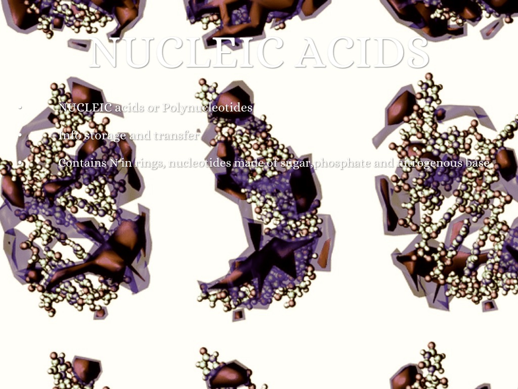 Contains N in rings, nucleotides made of sugar,phosphate and nitrogenous base