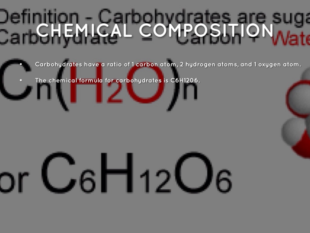 Carbohydrates have a ratio of 1 carbon atom, 2 hydrogen atoms, and 1 oxygen atom.