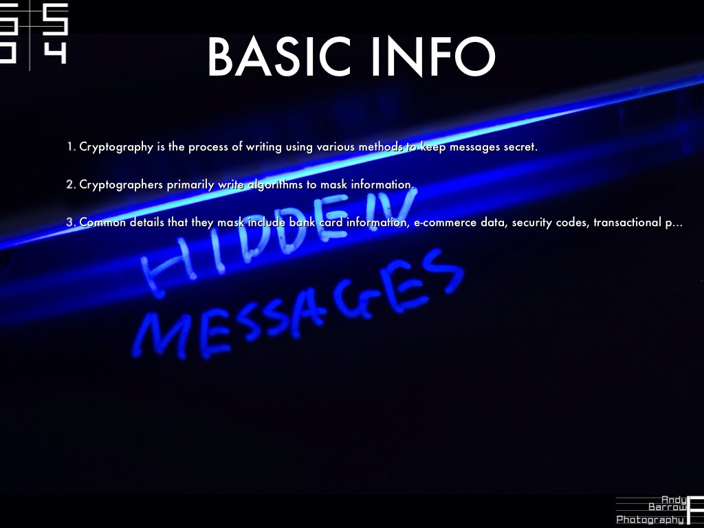 Cryptography is the process of writing using various methods to keep messages secret.