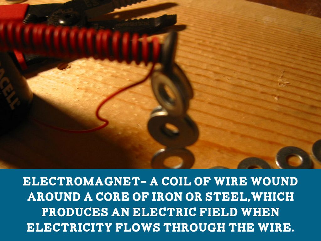Electromagnet- a coil of wire wound around a core of iron or steel,which produces an electric field when electricity flows through the wire.