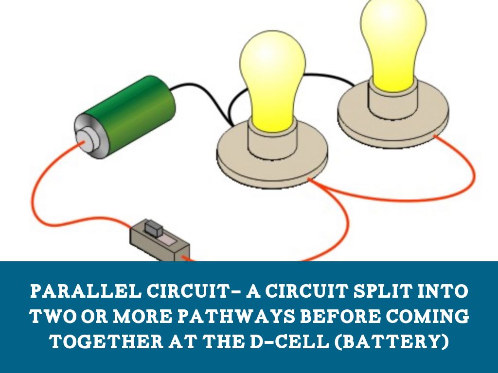 parallel circuit- a circuit split into two or more pathways before coming together at the d-cell (battery)