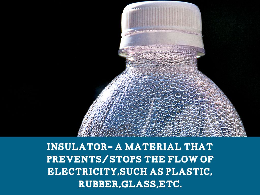 Insulator- a material that prevents/stops the flow of electricity,such as plastic, rubber,glass,etc.