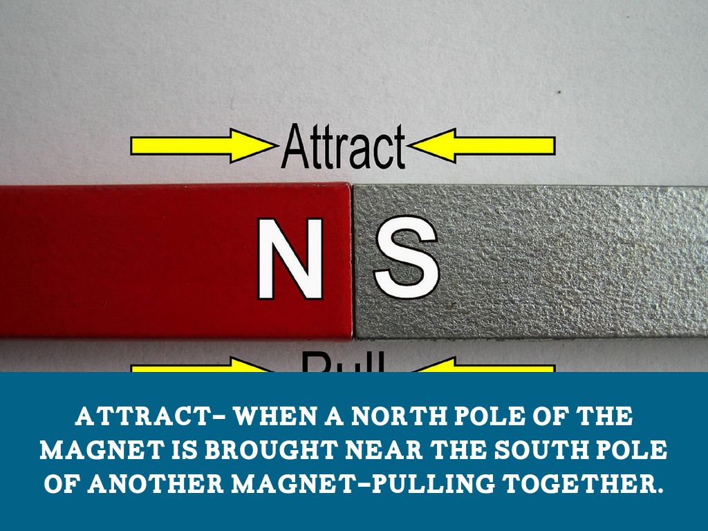 attract- when a north pole of the magnet is brought near the south pole of another magnet-pulling together.