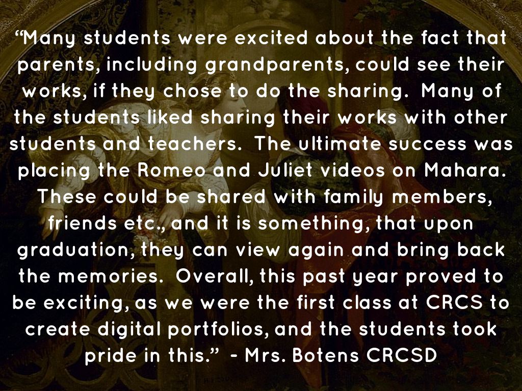 “Many students were excited about the fact that parents, including grandparents, could see their works, if they chose to do the sharing. Many of the students liked sharing their works with other students and teachers. The ultimate success was placing the Romeo and Juliet videos on Mahara. These could be shared with family members, friends etc., and it is something, that upon graduation, they can view again and bring back the memories. Overall, this past year proved to be exciting, as we were the first class at CRCS to create digital portfolios, and the students took pride in this.” - Mrs. Botens CRCSD