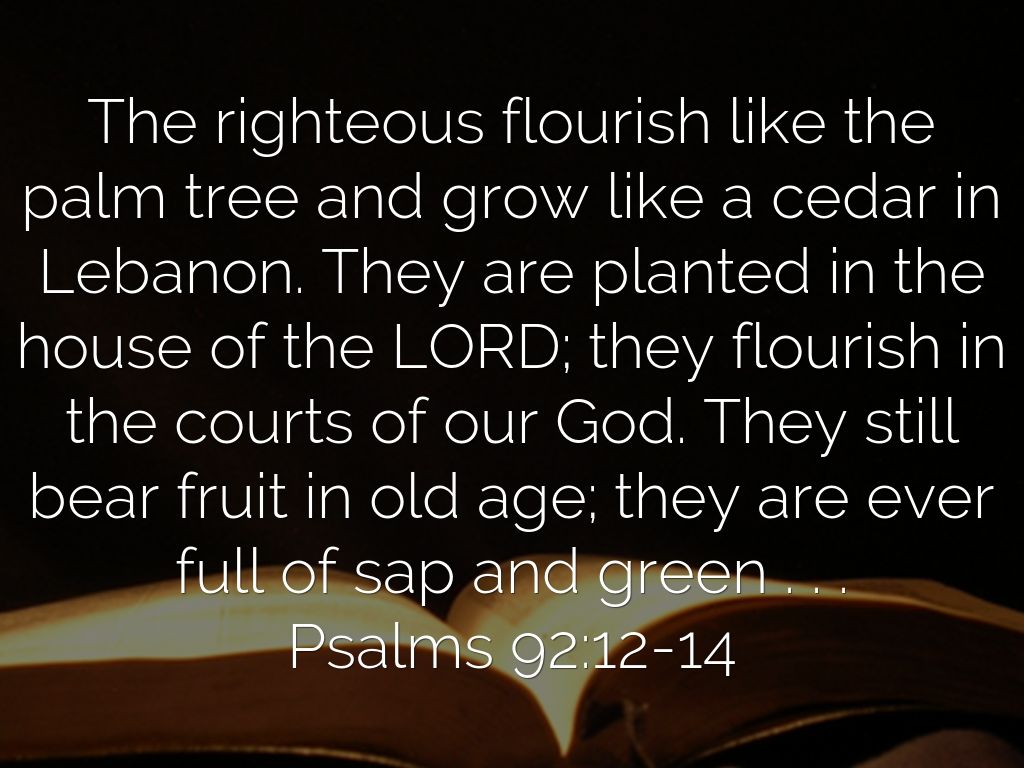 The righteous flourish like the palm tree and grow like a cedar in Lebanon. They are planted in the house of the LORD; they flourish in the courts of our God. They still bear fruit in old age; they are ever full of sap and green . . . Psalms 92:12-14