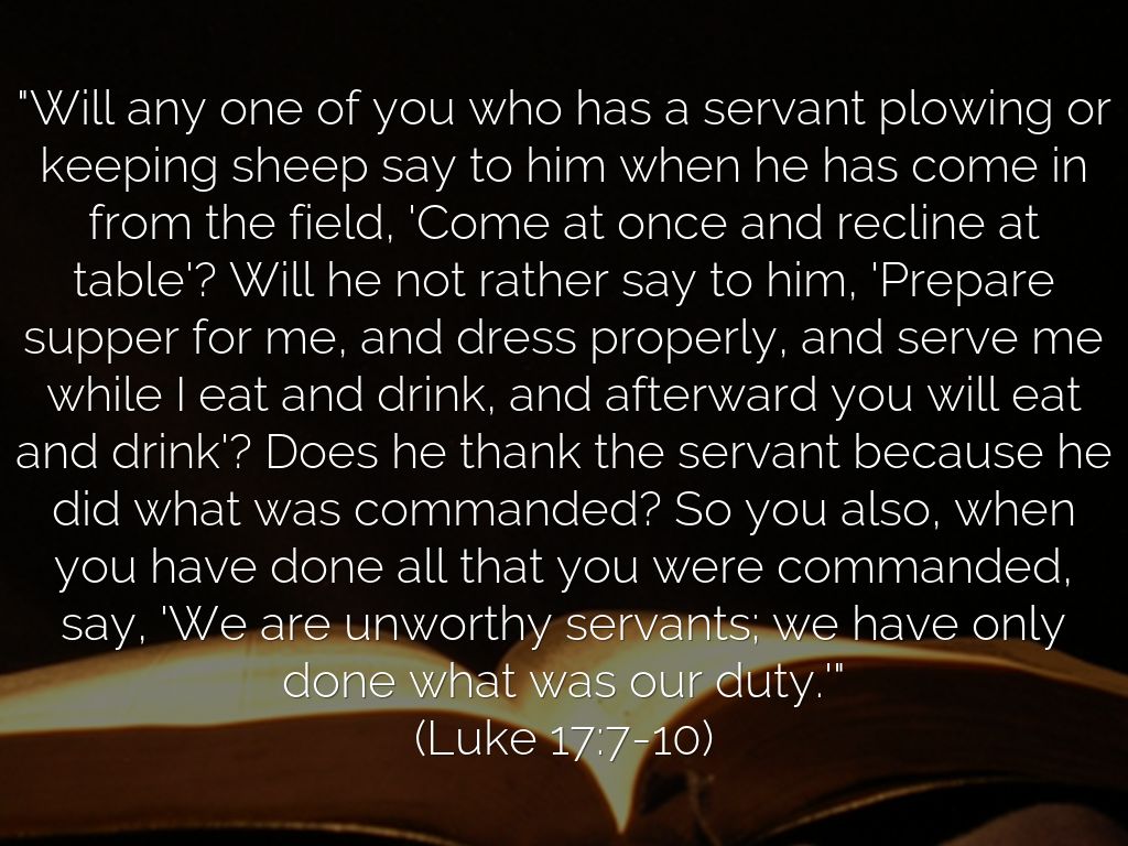 "Will any one of you who has a servant plowing or keeping sheep say to him when he has come in from the field, 'Come at once and recline at table'? Will he not rather say to him, 'Prepare supper for me, and dress properly, and serve me while I eat and drink, and afterward you will eat and drink'? Does he thank the servant because he did what was commanded? So you also, when you have done all that you were commanded, say, 'We are unworthy servants; we have only done what was our duty.'" (Luke 17:7-10)