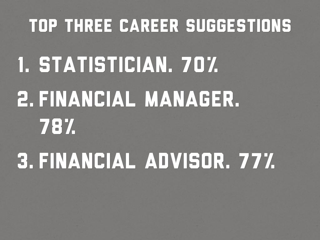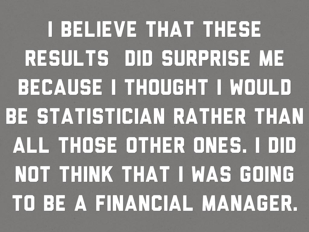 I believe that these results did surprise me because I thought I would be Statistician rather than all those other ones. I did not think that I was going to be a financial manager.