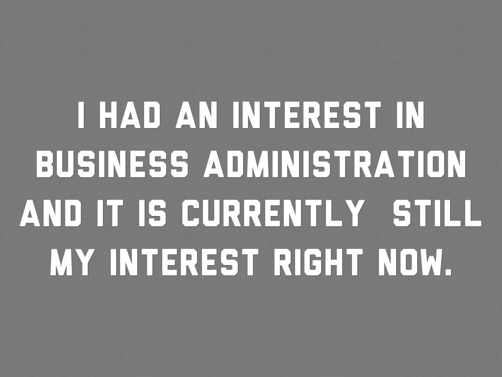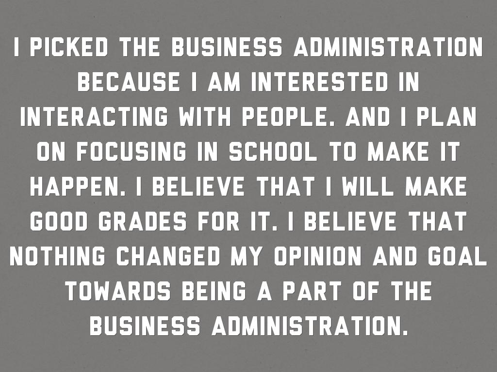 I picked the business administration because i am interested in interacting with people. And I plan on focusing in school to make it happen. I believe that I will make good grades for it. I believe that nothing changed my opinion and goal towards being a part of the business administration.