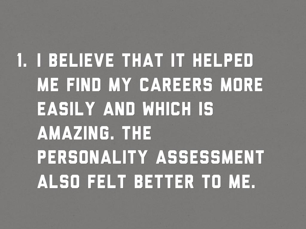 • I believe that it helped me find my careers more easily and which is amazing. The personality assessment also felt better to me.