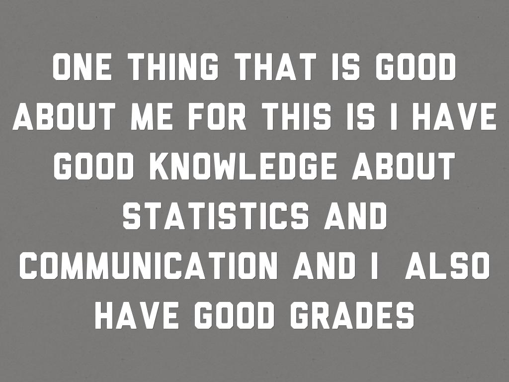 One thing that is good about me for this is I have good knowledge about statistics and communication and I also have good grades