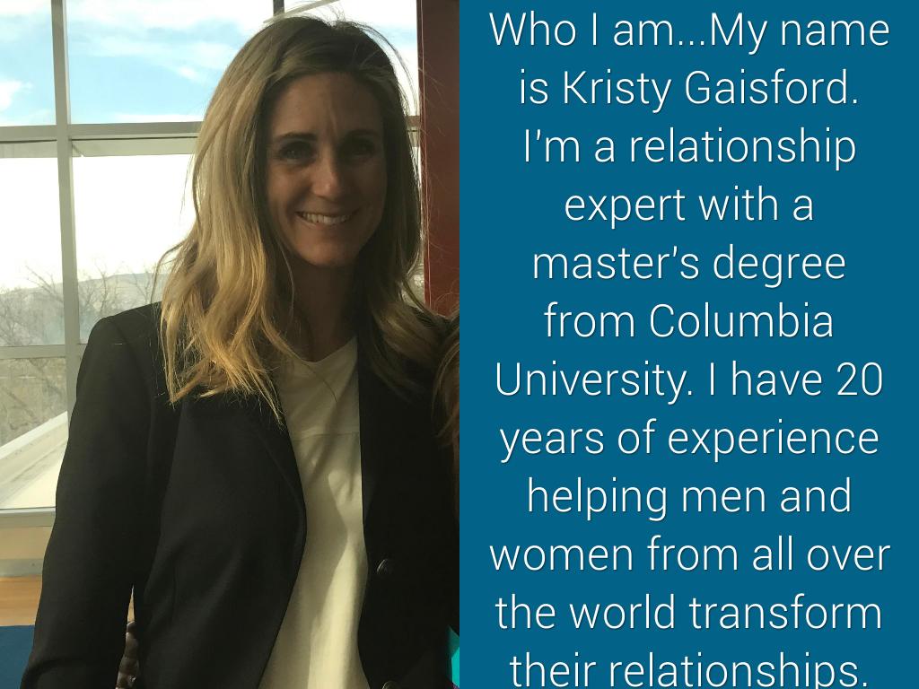 Who I am...My name is Kristy Gaisford. I'm a relationship expert with a master's degree from Columbia University. I have 20 years of experience helping men and women from all over the world transform their relationships.