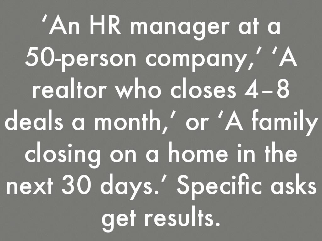 ‘An HR manager at a 50-person company,’ ‘A realtor who closes 4–8 deals a month,’ or ‘A family closing on a home in the next 30 days.’ Specific asks get results.