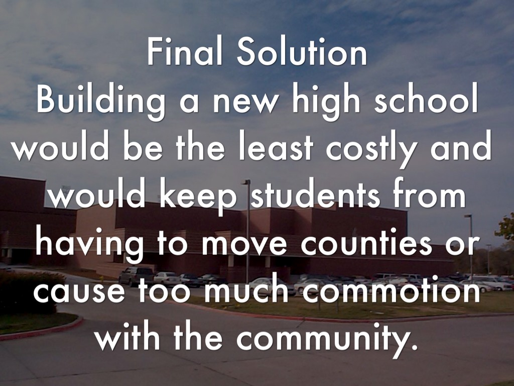 Final Solution Building a new high school would be the least costly and would keep students from having to move counties or cause too much commotion with the community.