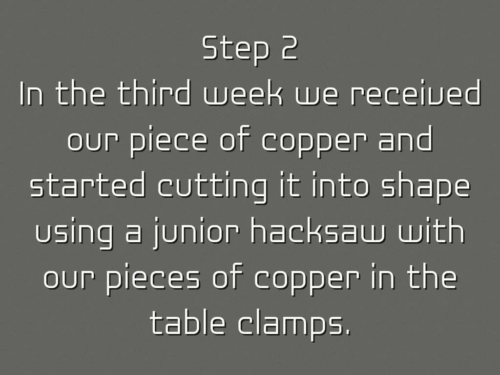 In the third week we received our piece of copper and started cutting it into shape using a junior hacksaw with our pieces of copper in the table clamps.