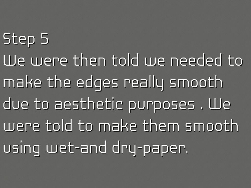 We were then told we needed to make the edges really smooth due to aesthetic purposes . We were told to make them smooth using wet-and dry-paper.