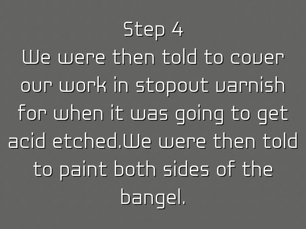 We were then told to cover our work in stopout varnish for when it was going to get acid etched.We were then told to paint both sides of the bangel.
