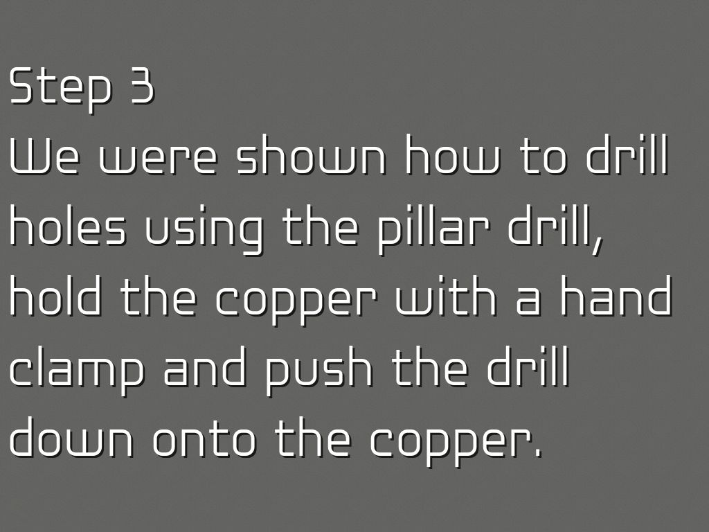 We were shown how to drill holes using the pillar drill, hold the copper with a hand clamp and push the drill down onto the copper.