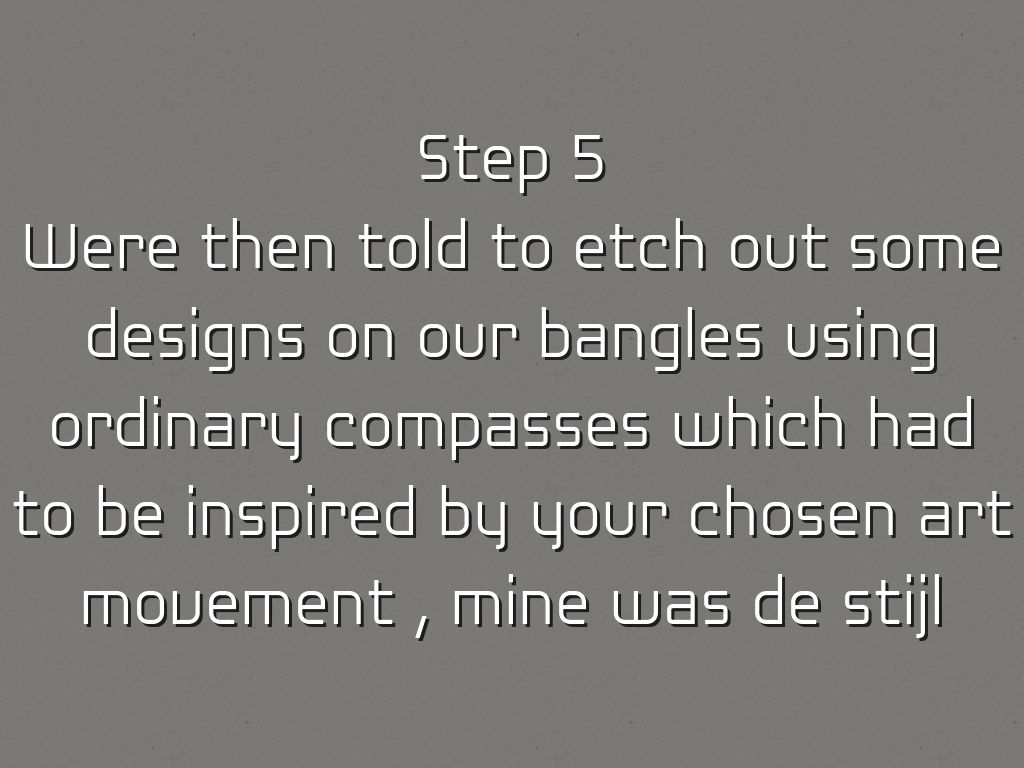 Were then told to etch out some designs on our bangles using ordinary compasses which had to be inspired by your chosen art movement , mine was de stijl