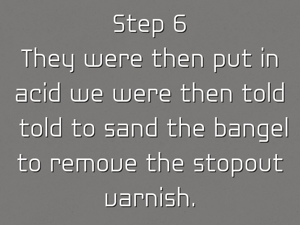 They were then put in acid we were then told told to sand the bangel to remove the stopout varnish.