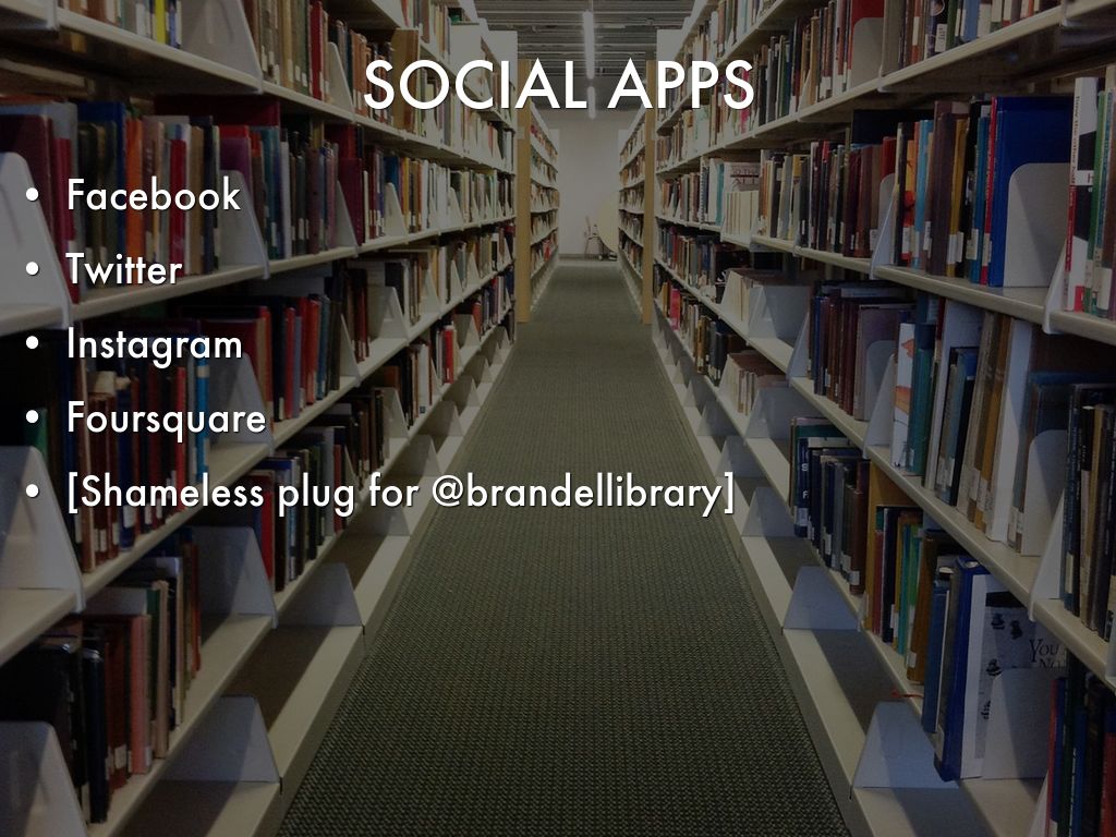 http://lj.libraryjournal.com/2013/06/opinion/aaron-schmidt/focus-on-people-...A few examples taken from my library experience. I wanted to "improve the library's facebook page" - but that's focusing on the technology and not the ultimate goal - to connect with people who use the Brandel library.