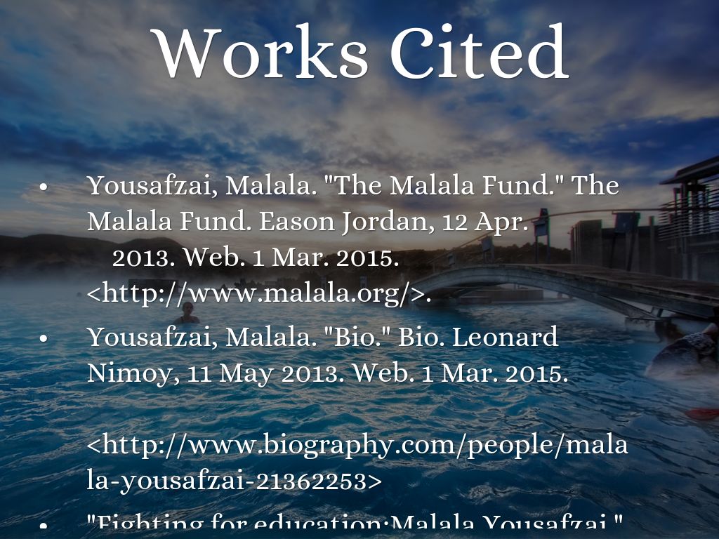 Yousafzai, Malala. "Bio." Bio. Leonard Nimoy, 11 May 2013. Web. 1 Mar. 2015.