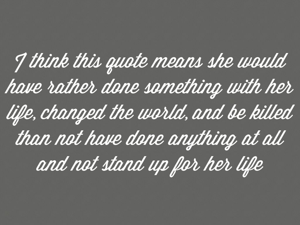 I think this quote means she would have rather done something with her life, changed the world, and be killed than not have done anything at all and not stand up for her life