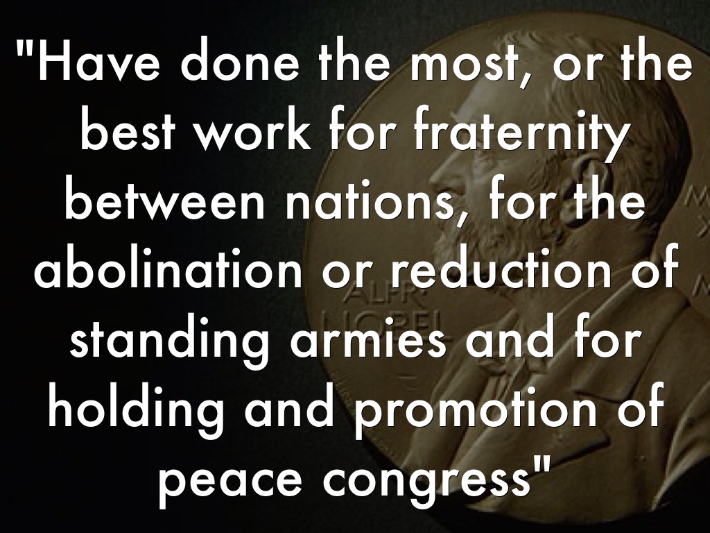 "Have done the most, or the best work for fraternity between nations, for the abolination or reduction of standing armies and for holding and promotion of peace congress"