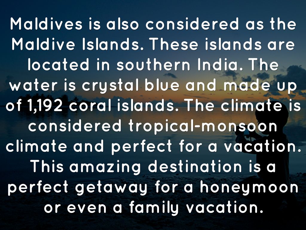 Maldives is also considered as the Maldive Islands. These islands are located in southern India. The water is crystal blue and made up of 1,192 coral islands. The climate is considered tropical-monsoon climate and perfect for a vacation. This amazing destination is a perfect getaway for a honeymoon or even a family vacation.