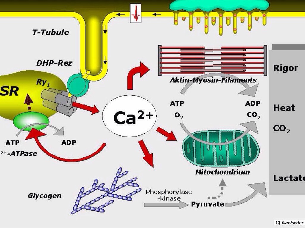 The primary MH defect resides in the skeletal muscle at the level of calcium release from the sarcoplastic reticulum of the muscle cell. The resulting hypercalcemia leads to hypermetabolism, which in turn results in increased sympathetic activity, increased carbon dioxide production, increased oxygen consumption, and disruption of the cell membranes. Muscle tissue is unable to return to a resting state in the susceptible patient, and because of this the primary signs of MH begin to appear (AORN 2012, p. 623-625).