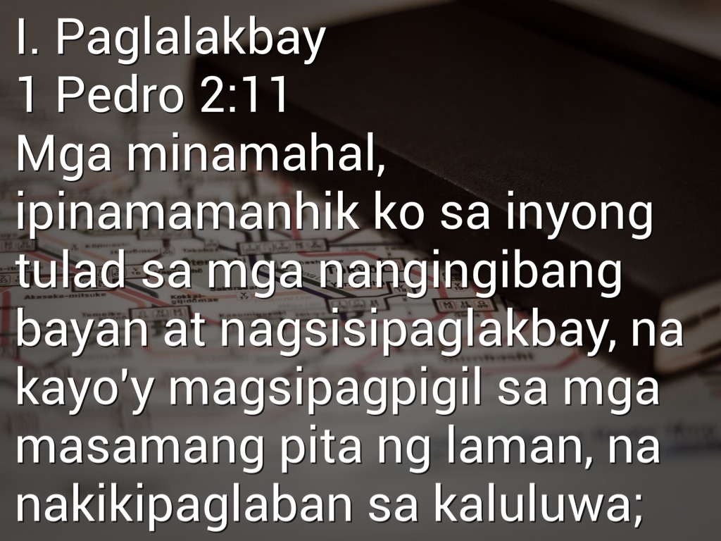 I. Paglalakbay 1 Pedro 2:11 Mga minamahal, ipinamamanhik ko sa inyong tulad sa mga nangingibang bayan at nagsisipaglakbay, na kayo'y magsipagpigil sa mga masamang pita ng laman, na nakikipaglaban sa kaluluwa;
