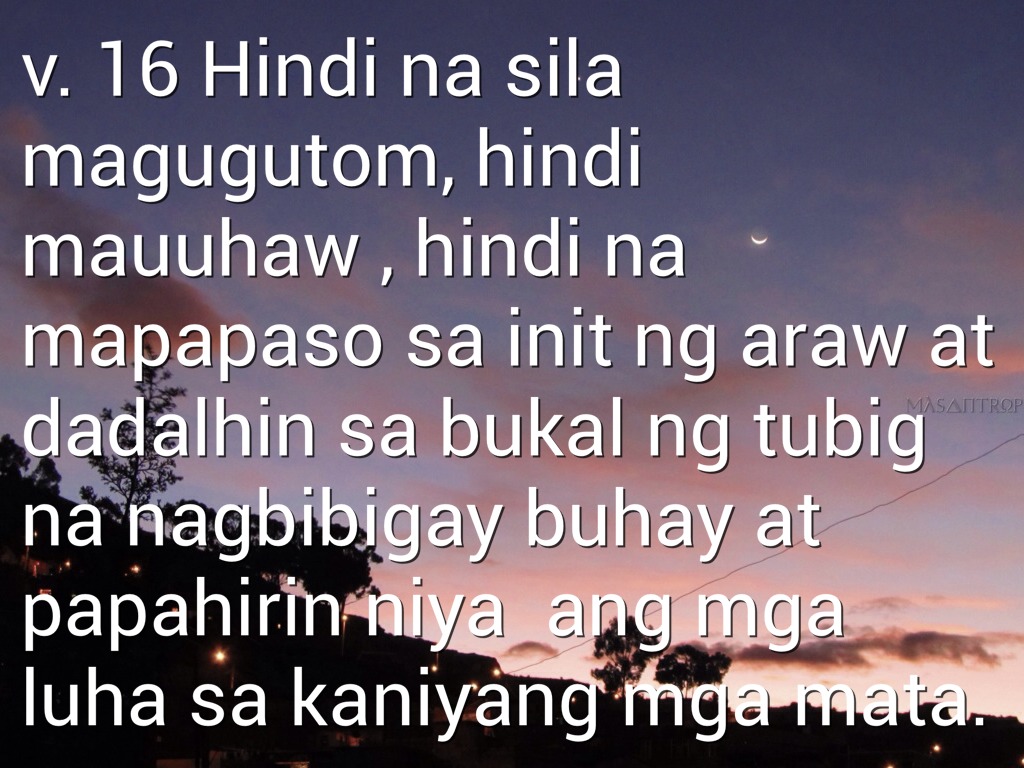 v. 16 Hindi na sila magugutom, hindi mauuhaw , hindi na mapapaso sa init ng araw at dadalhin sa bukal ng tubig na nagbibigay buhay at papahirin niya ang mga luha sa kaniyang mga mata.