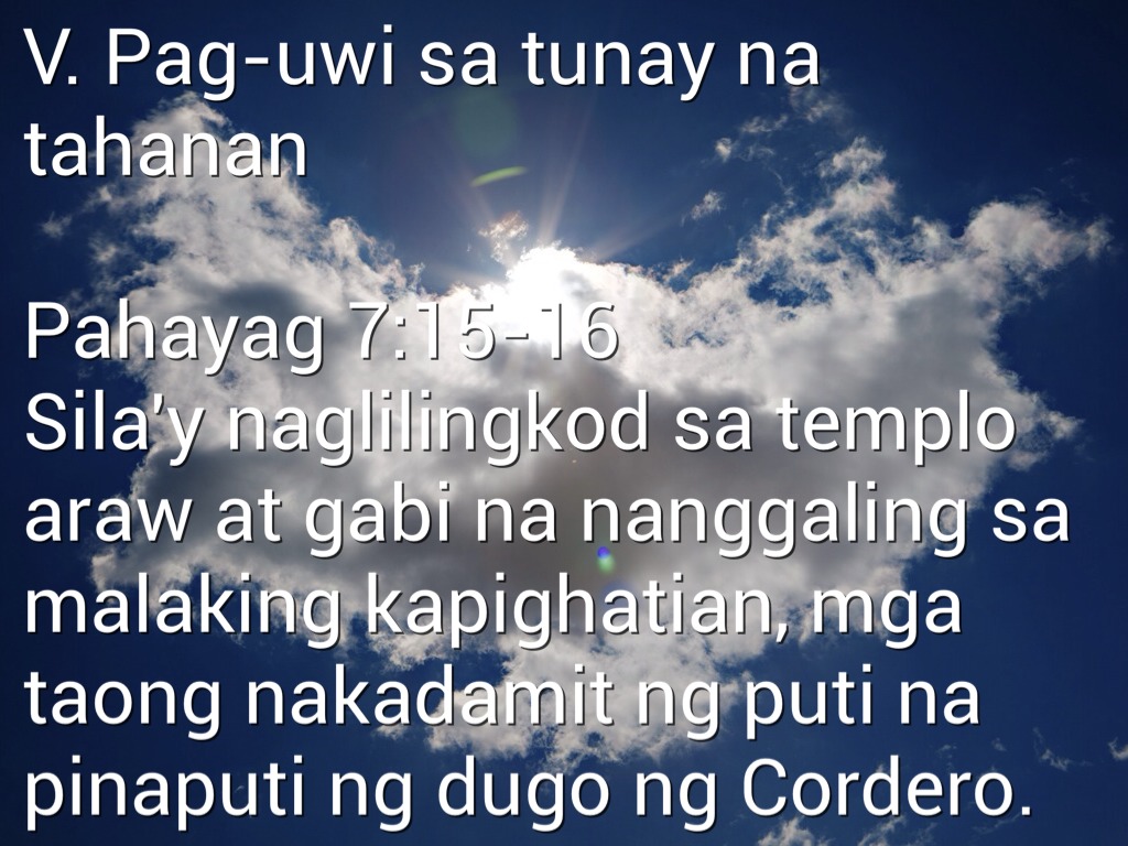 Pahayag 7:15-16 Sila'y naglilingkod sa templo araw at gabi na nanggaling sa malaking kapighatian, mga taong nakadamit ng puti na pinaputi ng dugo ng Cordero.