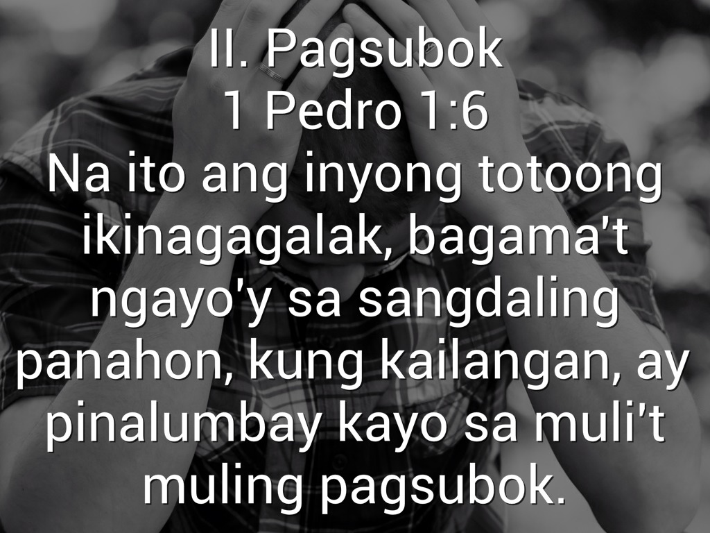 II. Pagsubok 1 Pedro 1:6 Na ito ang inyong totoong ikinagagalak, bagama't ngayo'y sa sangdaling panahon, kung kailangan, ay pinalumbay kayo sa muli't muling pagsubok.