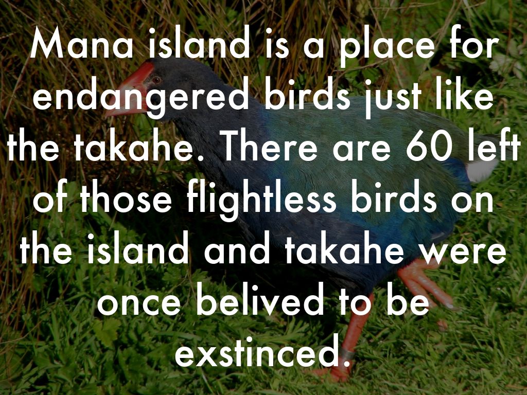 Mana island is a place for endangered birds just like the takahe. There are 60 left of those flightless birds on the island and takahe were once belived to be exstinced.