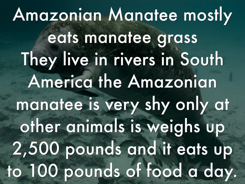Amazonian Manatee mostly eats manatee grass They live in rivers in South America the Amazonian manatee is very shy only at other animals is weighs up 2,500 pounds and it eats up to 100 pounds of food a day.